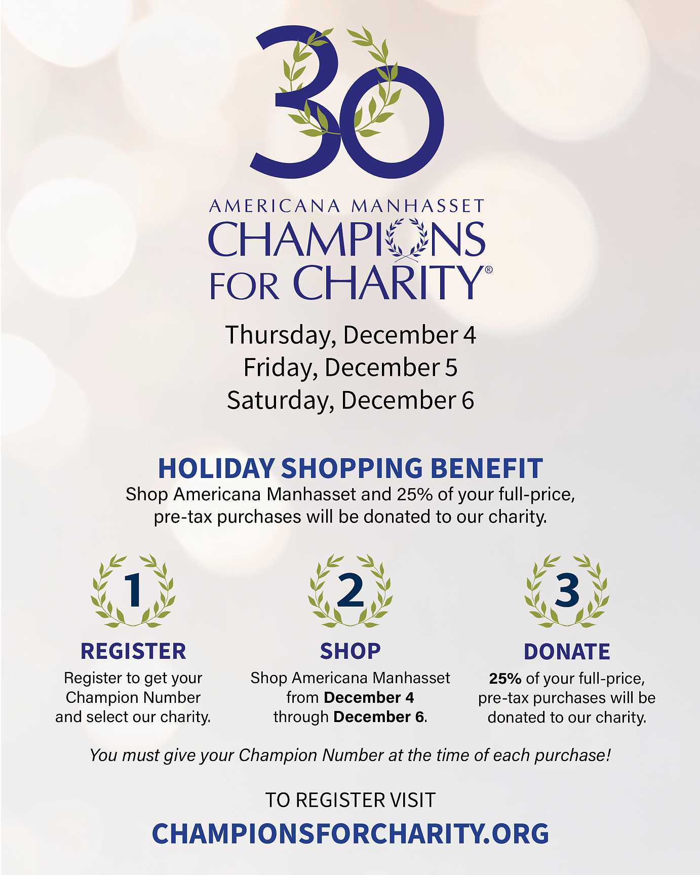 Donations will be made on full-price merchandise only and some product exclusions may apply, subject to individual store policy. Returns or exchanges made on merchandise purchased towards Champions for Charity® are subject to individual store policy. Participating store gift certificates and special order merchandise are subject to individual store policy. Americana Manhasset GiftCards and American Express® gift cards purchased during Champions for Charity® are not eligible for a donation. Wheatley Plaza stores do not participate.